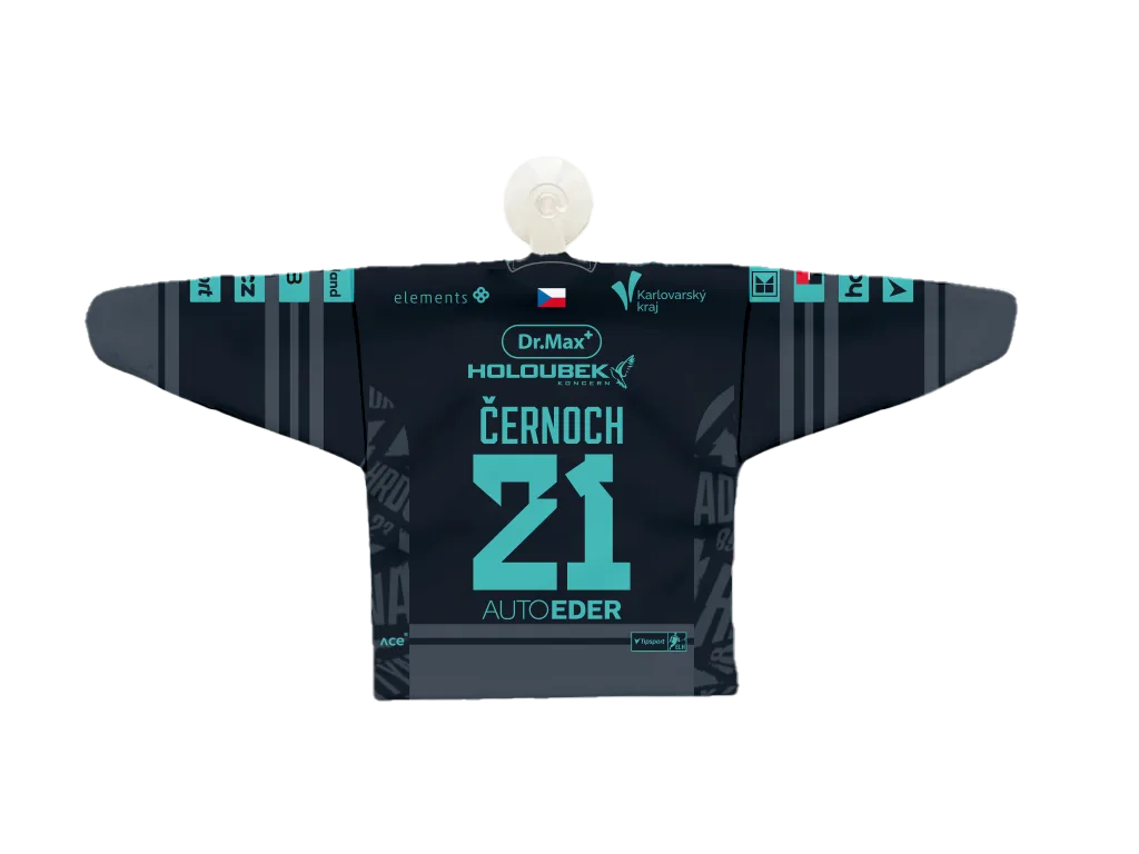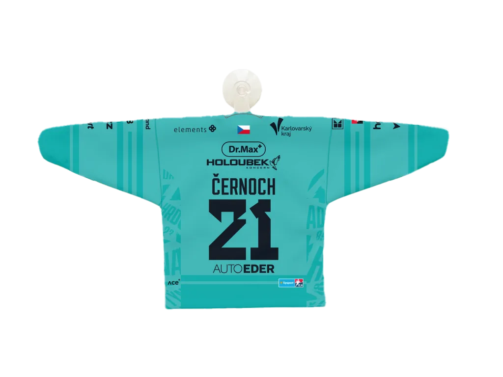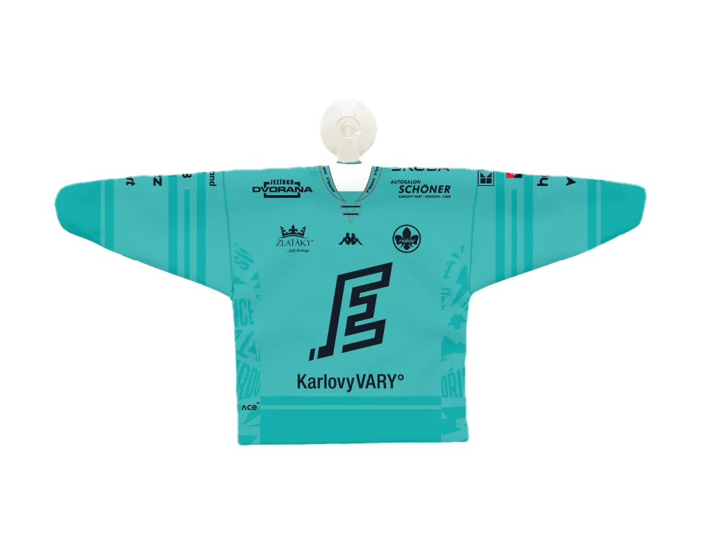 Stylový minidres HC Energie Karlovy Vary pro sezónu 25–26 je zmenšenou verzí oficiálního dresu. Dostupný je v domácí tmavé (černá s tyrkysovými detaily) i venkovní světlé variantě (tyrkysová s černými detaily). Každý fanoušek si může vybrat oblíbeného hráče – Jiřího Černocha, Ondřeje Beránka, Dominika Frodla (číslo 0), Víta Jiskru nebo Petra Tomka. Díky přísavce lze minidres snadno zavěsit třeba do auta, na okno nebo jinam, kde vám bude připomínat atmosféru zápasů. Skvělý doplněk pro všechny fanoušky Energie.