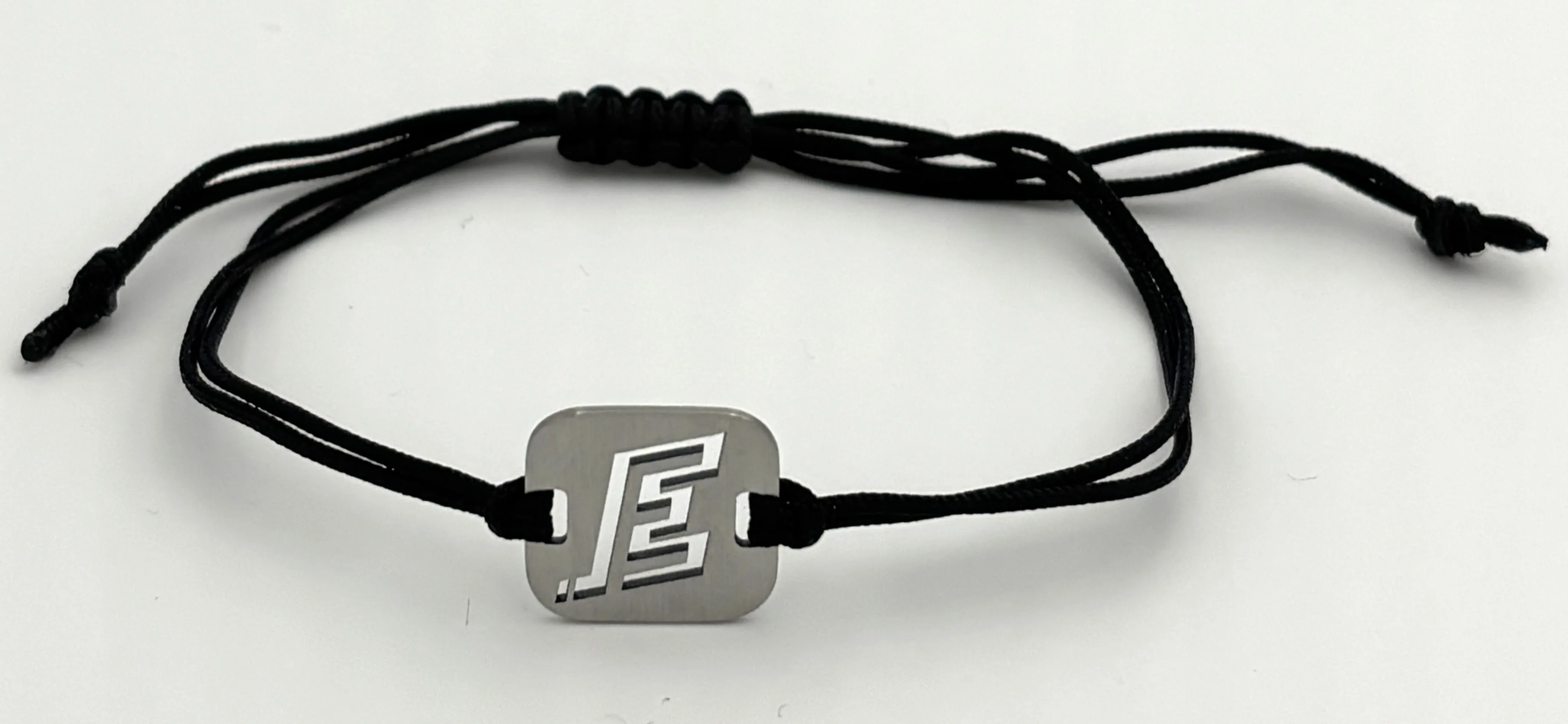 Náramek z nerezové oceli na černé šňůrce.