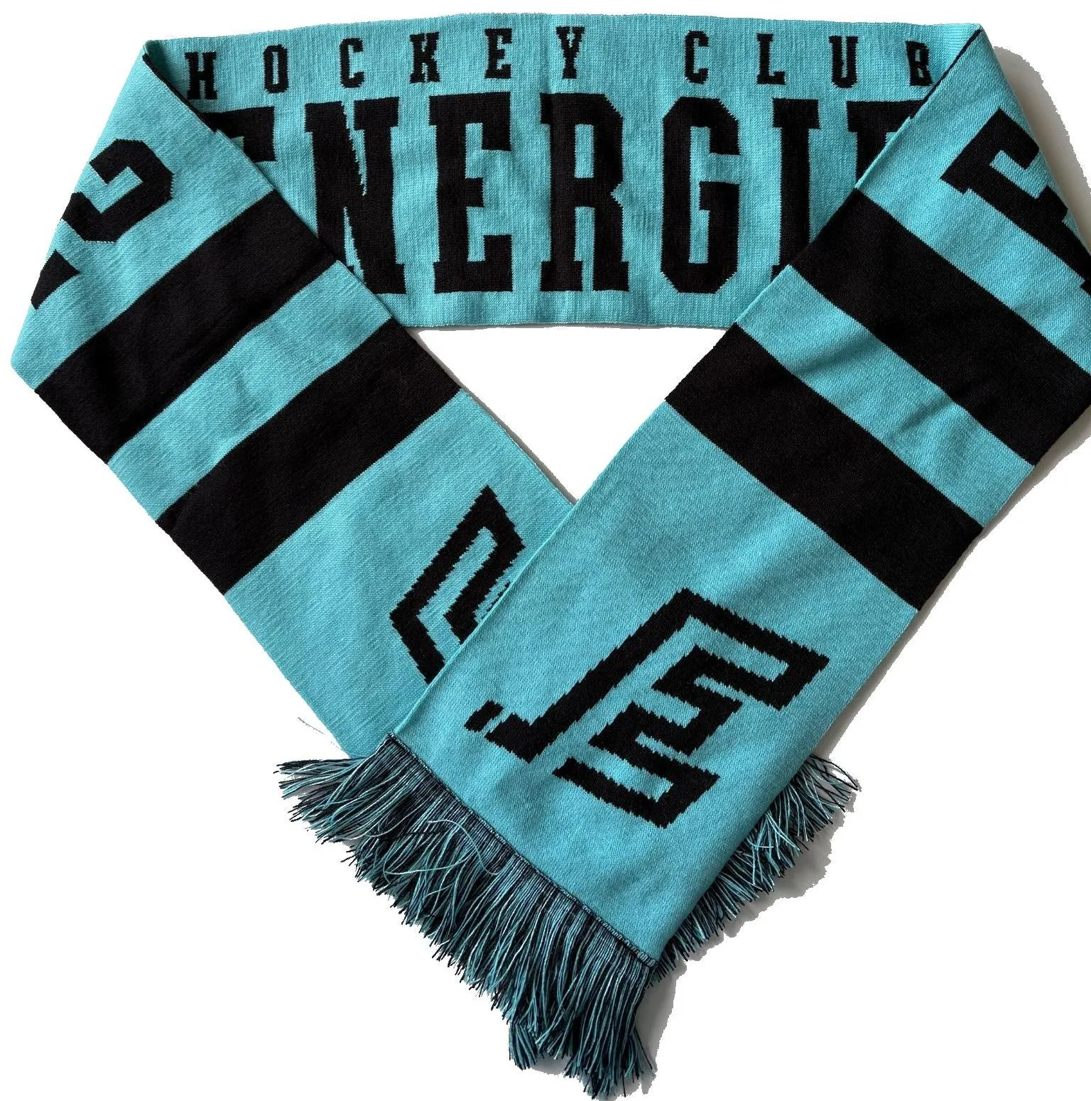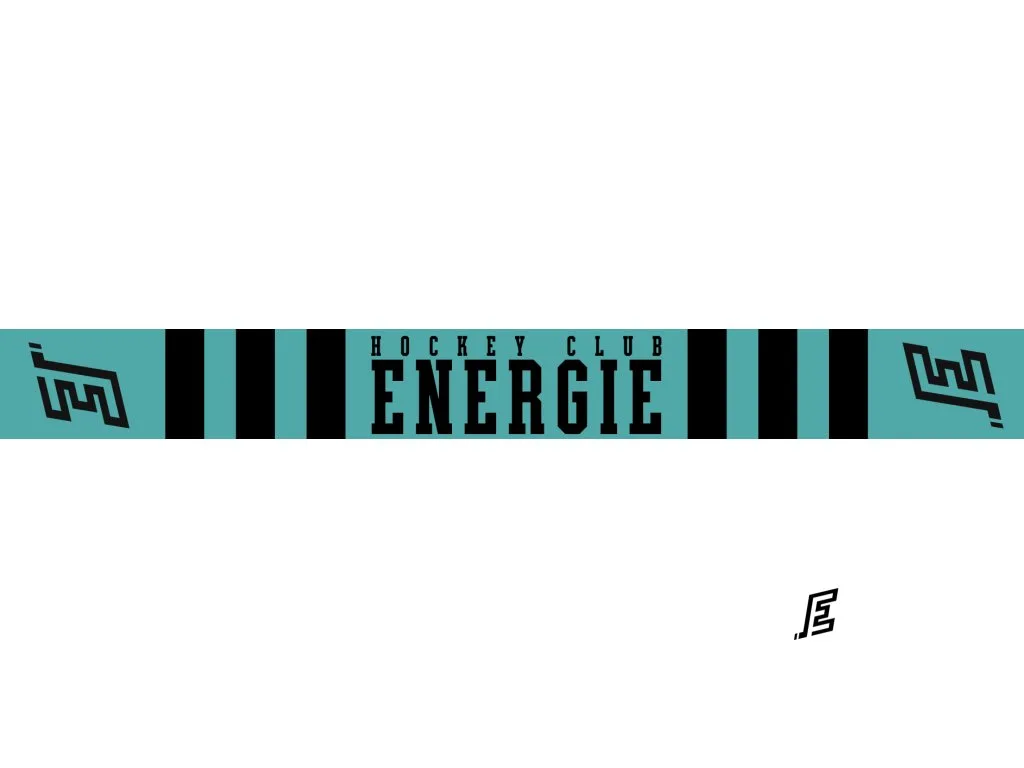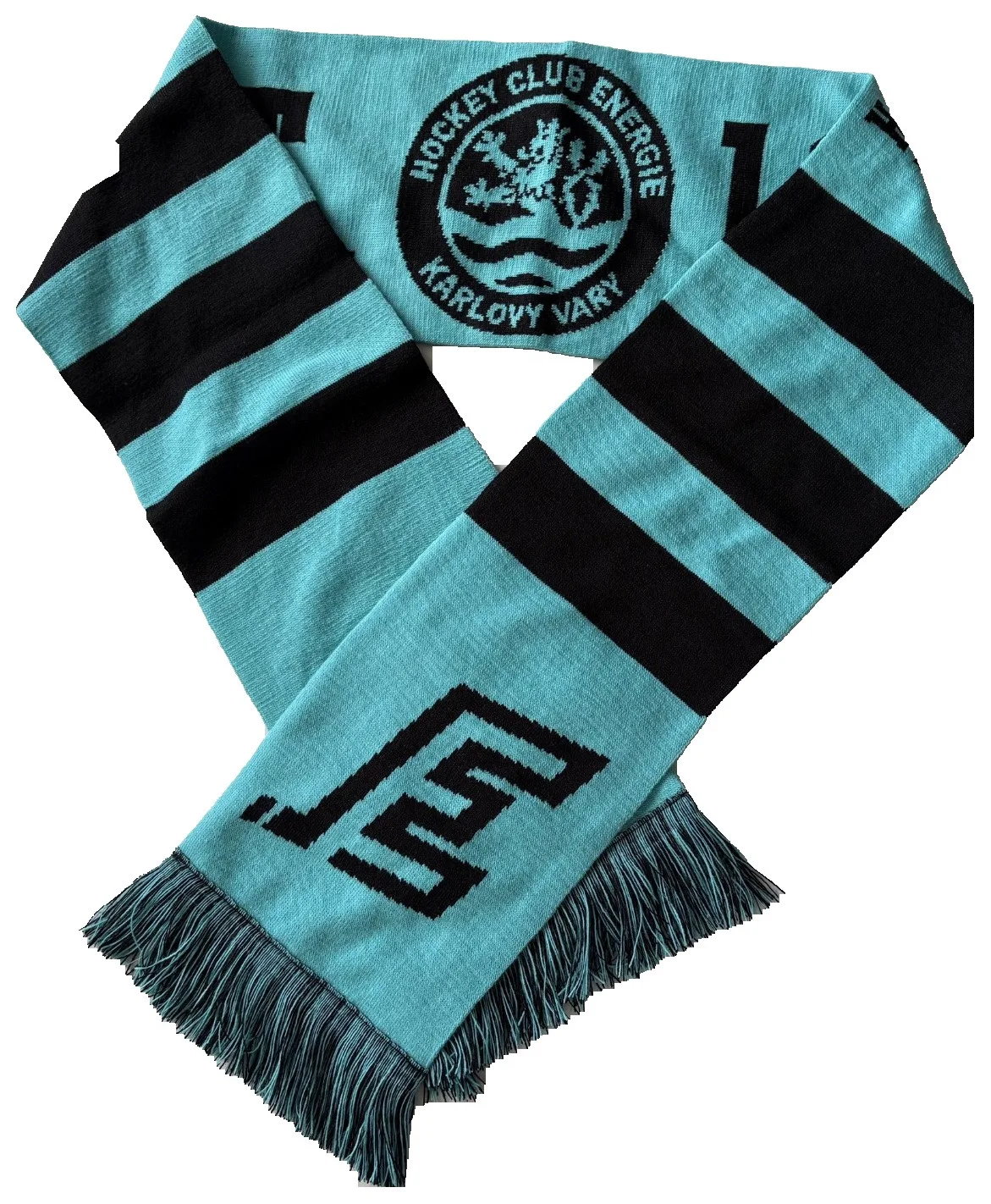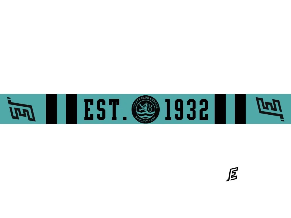 Černo-tyrkysová šála HC Energie 25–26. Oboustranný design s nápisem ENERGIE a motivem lva a rokem založení klubu 1932.