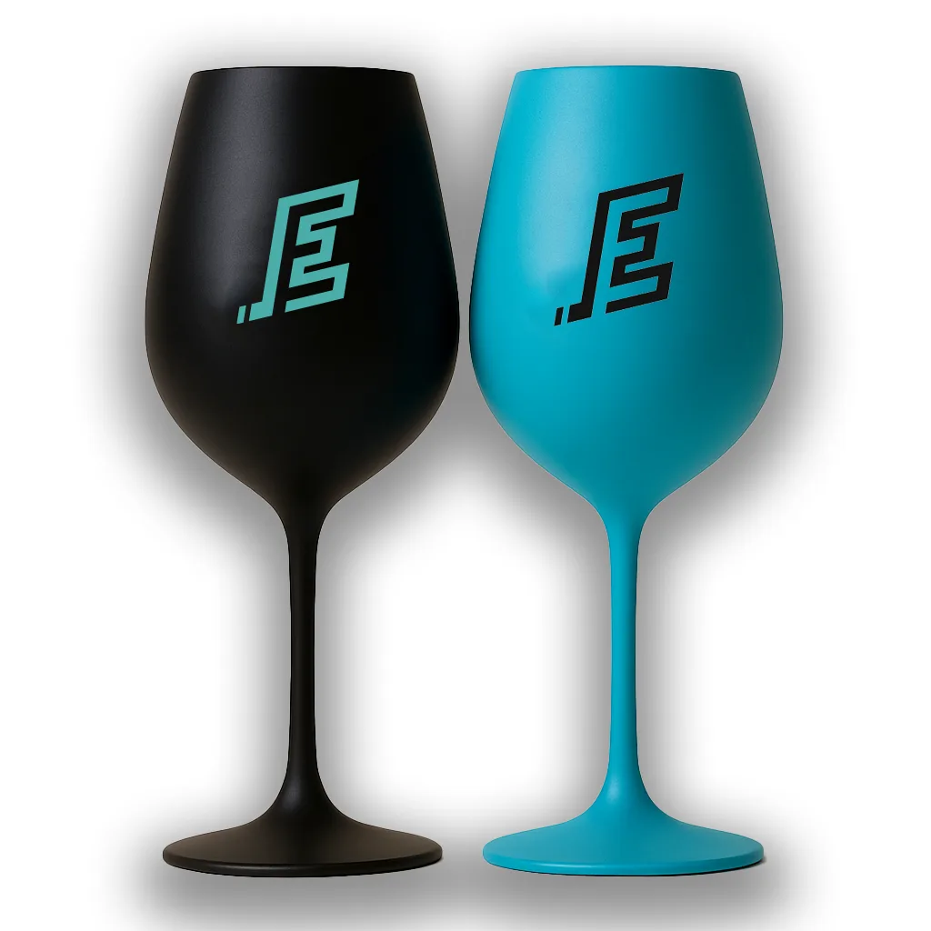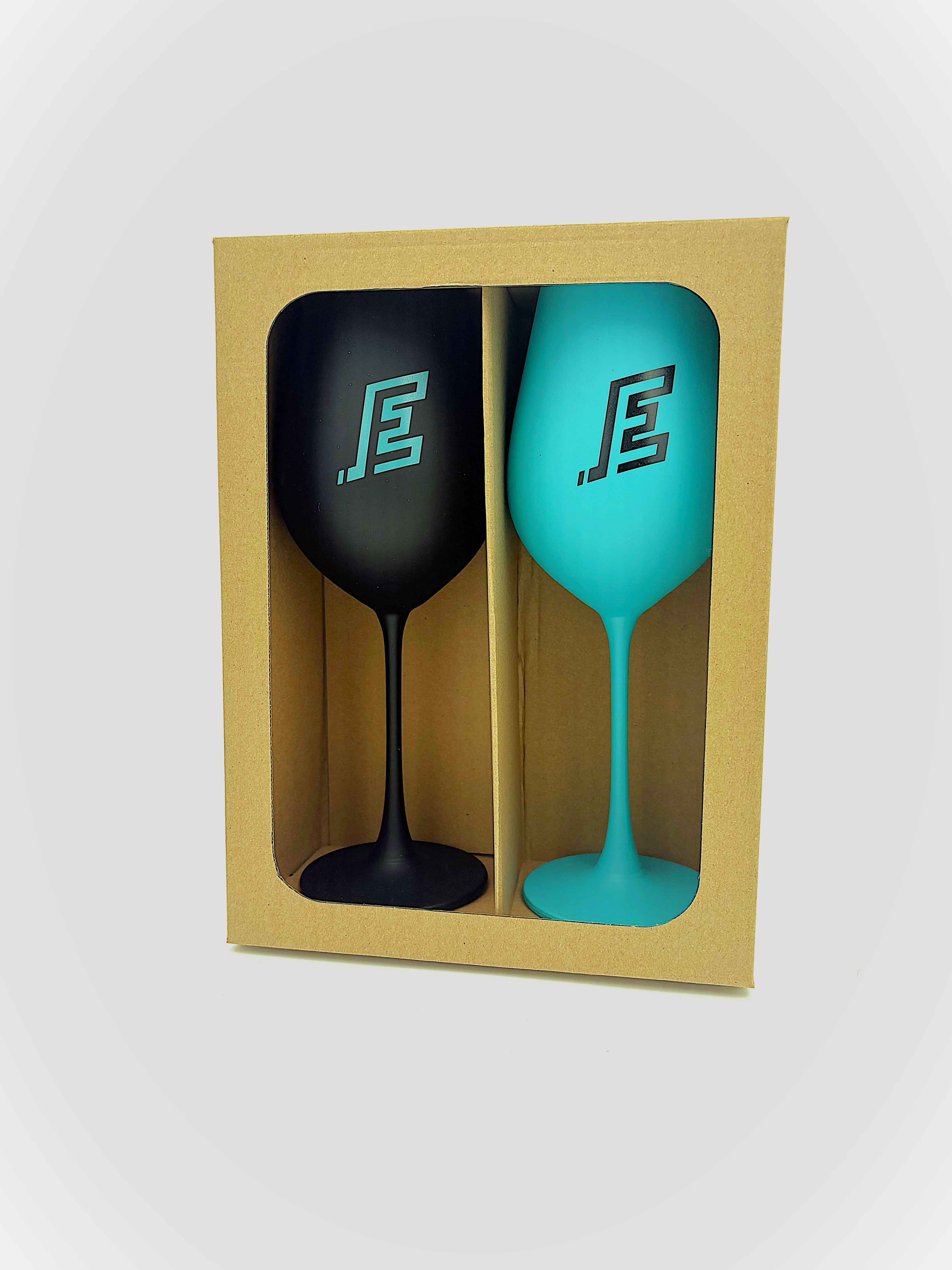Sklenice na víno, z matného skla s kontrastním logem na boku. Sklenice jsou balené po dvou kusech v kombinaci černé a tyrkysové barvy v kartonové krabici.