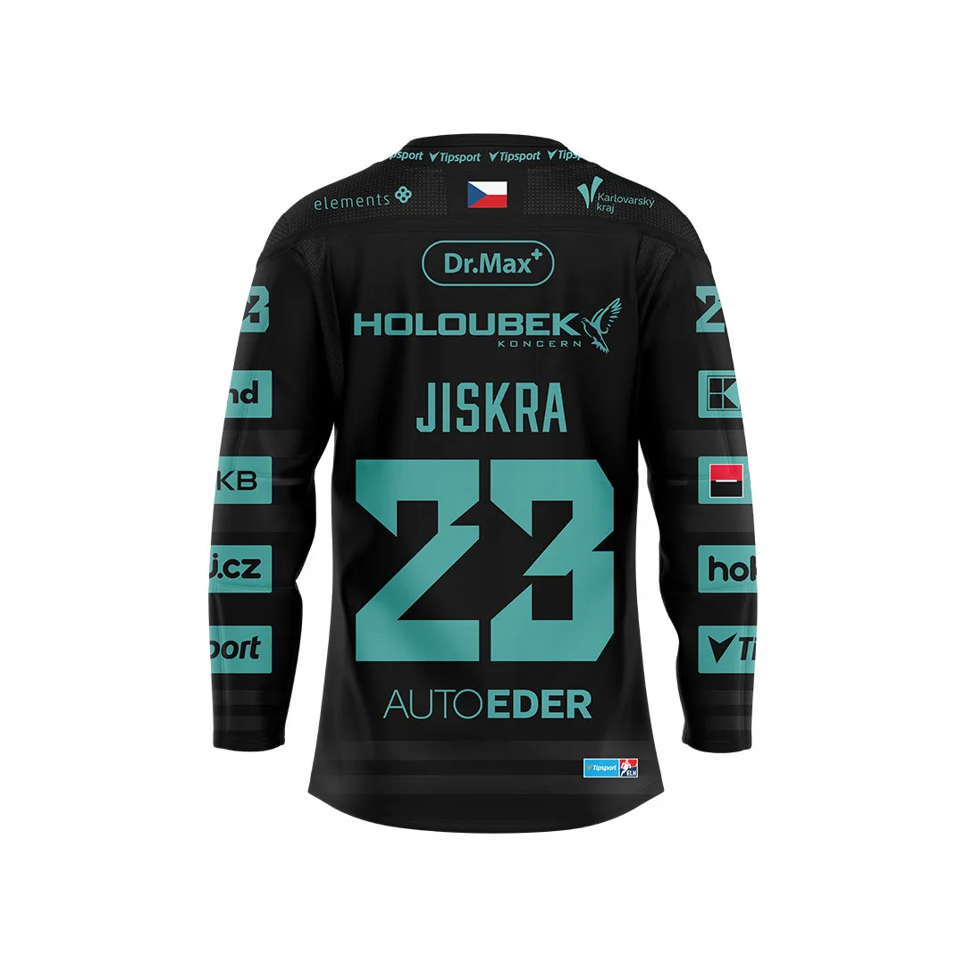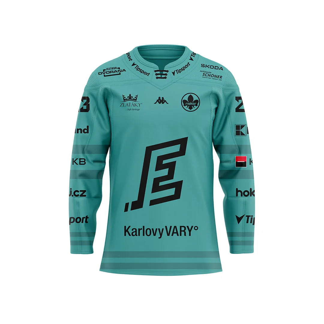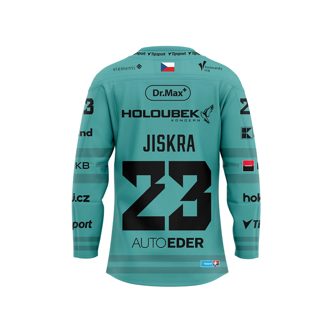 Oficiální fandres HC Energie pro sezónu 25–26, který nese jméno Víta Jiskry. Dostupný v domácí tmavé i venkovní světlé variantě. Nová tyrkysová barva odkazuje na prameny a řeky karlovarského kraje.