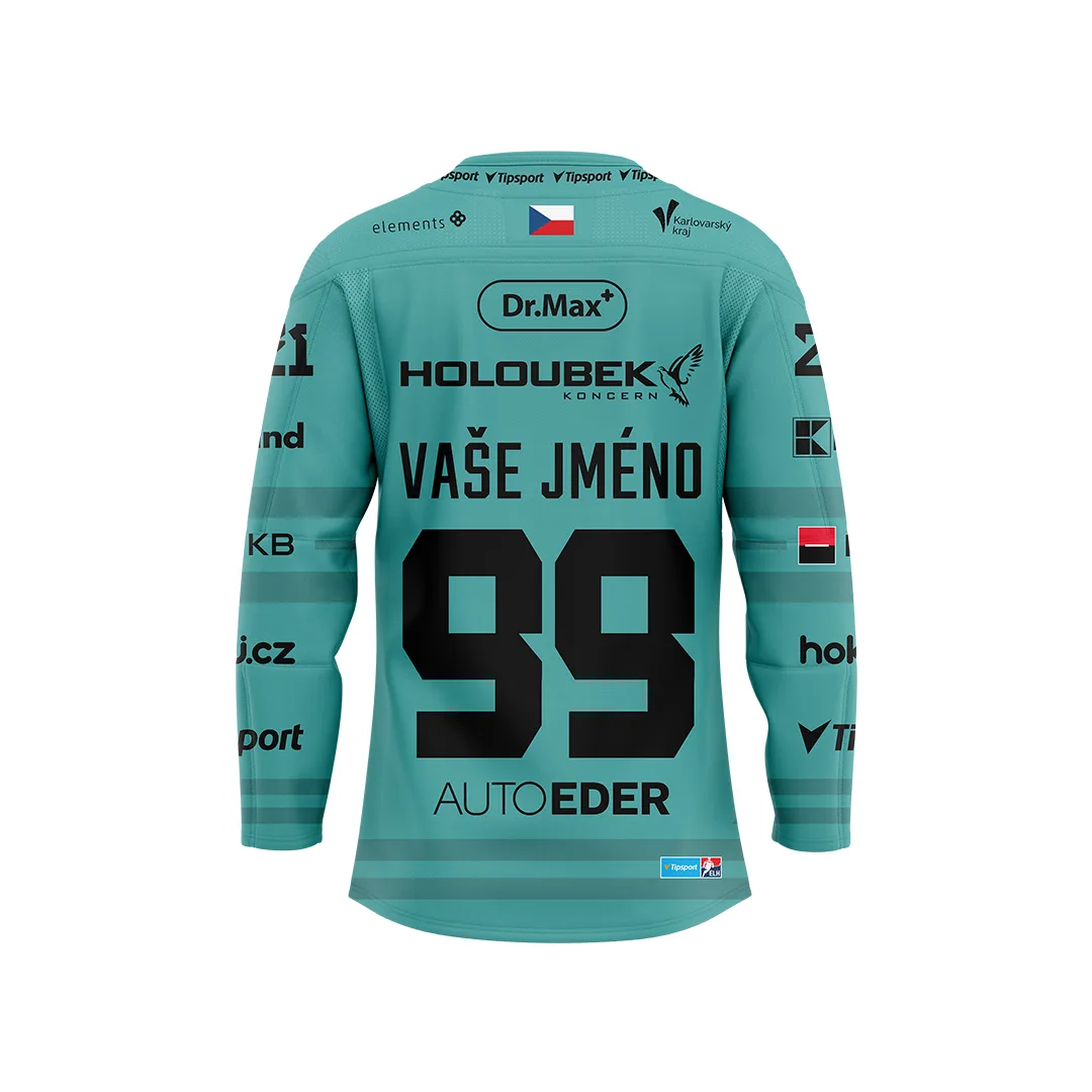 Originální hráčský dres HC Energie 25–26 na objednávku — venkovní tyrkysový. Identický s dresem, který hráči nosí při venkovních zápasech. Jméno a číslo na přání.